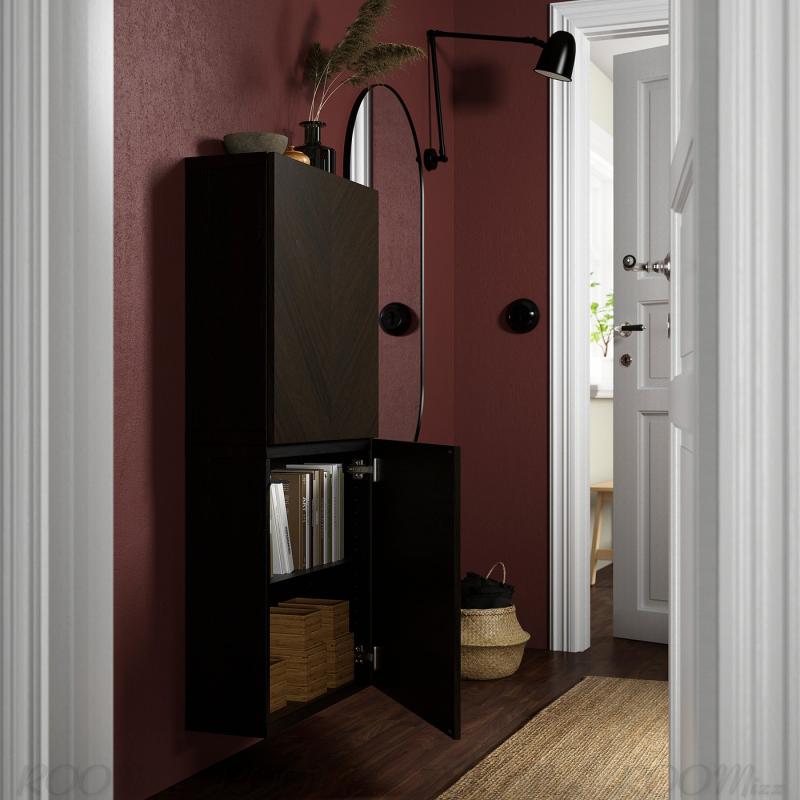 BESTÅ ベストー 壁取り付け式キャビネットコンビネーション - ブラックブラウン ヘデヴィーケン/ダークブラウン ステインオーク材突き板 60x22x64 cm