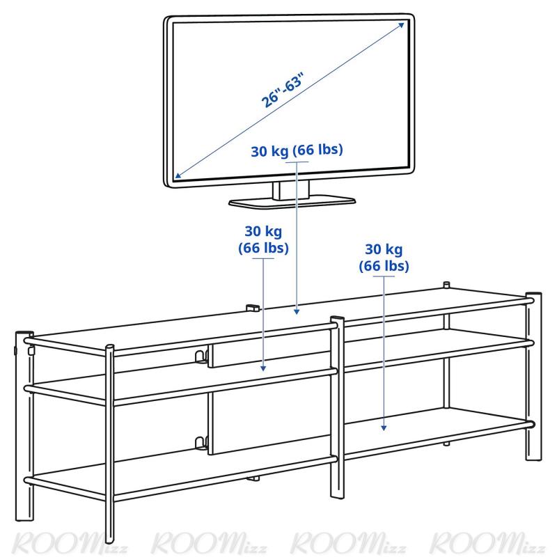 テレビ台は、上に置くテレビの幅より少し幅が広いものをお選びください。このテレビ台は63インチまでのテレビを置くのに最適です。それよりも大きいサイズのテレビは、天板の最大荷重より軽い場合に限り、置くことができます