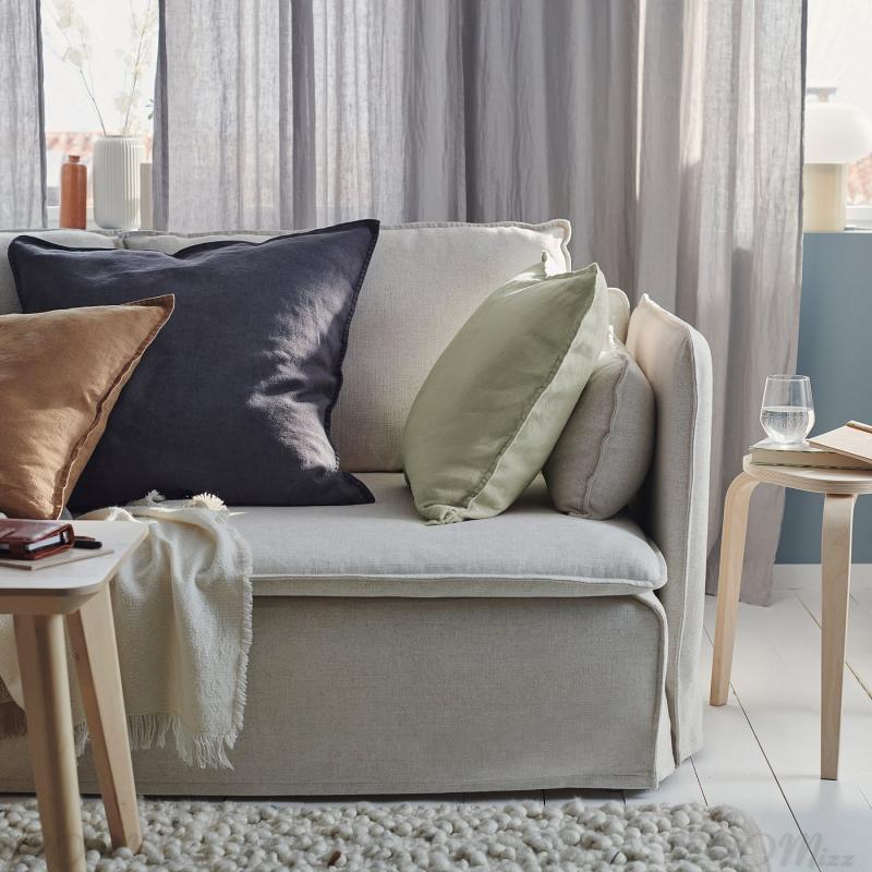 洗いをかけたグレーグリーンの麻(リネン)の布地は柔らかな質感で、カジュアルな飾らない見た目は洗うたびにさらによくなります。 DYTÅG/ディトーグ ひざ掛けやカーテン、ベッドリネンとコーディネートが楽しめます