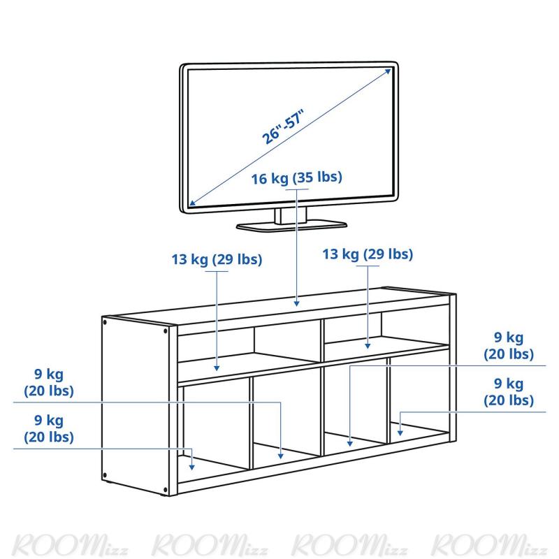 テレビ台は、上に置くテレビの幅より少し幅が広いものをお選びください。このテレビ台は57インチまでのテレビを置くのに最適です。それよりも大きいサイズのテレビは、天板の最大荷重より軽い場合に限り、置くことができます