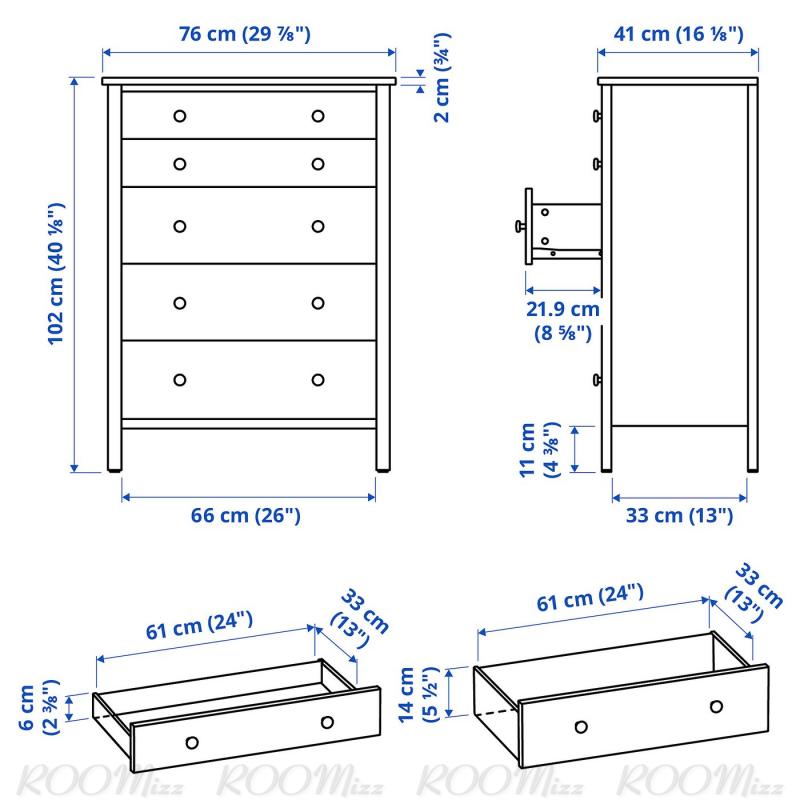 深い引き出し3個と浅い引き出し2個が付いた背の高いチェスト。大小さまざまなアイテムの収納や整理に便利です
