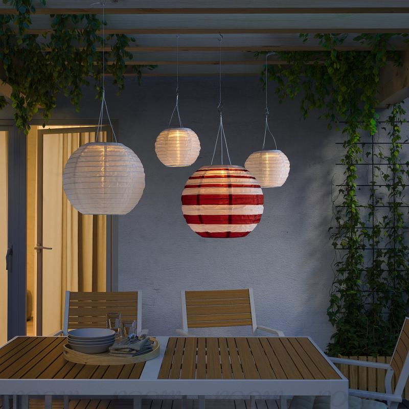 SOLVINDEN/ソルヴィンデン ペンダントランプを使えば、あっという間に屋外スペースが明るさと心地よさで満たされます。さまざまな色や模様、サイズを組み合わせましょう。すべて太陽電池式のLED電球とリサイクルしたペットボトルを原材料にしたシェードを使用しています