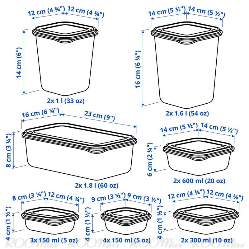 セット内容:保存容器(9×9×4cm、150ml)4個、保存容器(12×8×4cm、150ml)3個、保存容器(12×12×4cm、300ml)2個、保存容器(12×12×14cm、1L)2個、保存容器(14×14×6cm、600ml)2個、保存容器(14×14×16cm、1.6L)2個、保存容器(23×16×8cm、1.8L)2個