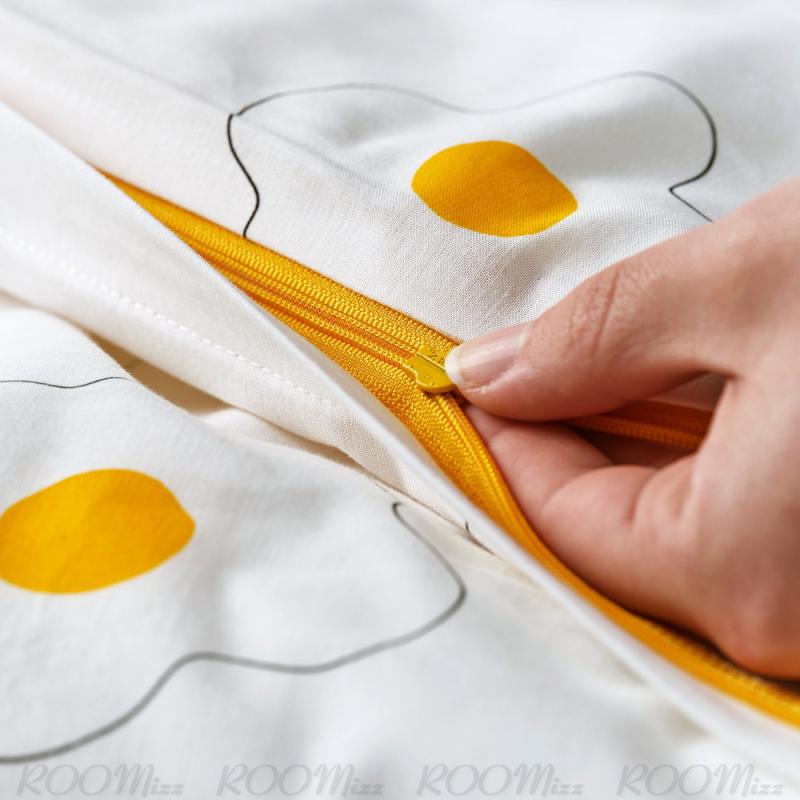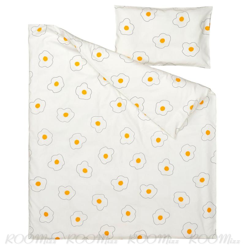 目玉焼き、それとも花? この模様は子ども用と大人用のベッドリネンの両方に使われています。遊び心のあるベビーベッド用リネンに合わせて、家族みんなでおそろいの掛け布団カバーにすれば、手軽にコーディネートが楽しめます