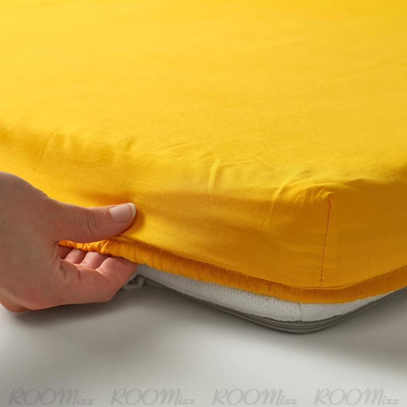 カバーにあしらった卵のようにも花のようにも見える模様と、おそろいのサニーイエローのボックスシーツが、遊び心のあるベビーベッドを演出します
