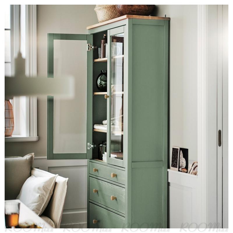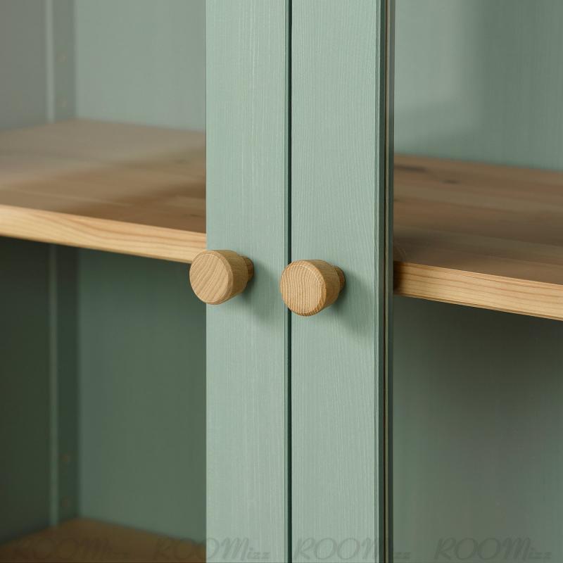 コレクションケースのグレーグリーンは室内に自然の調和的な色彩をもたらし、ライトブラウンステイン仕上げの棚板が木目の美しさを引き立てます。 HEMNES/ヘムネス シリーズのほかの家具とコーディネートが楽しめます