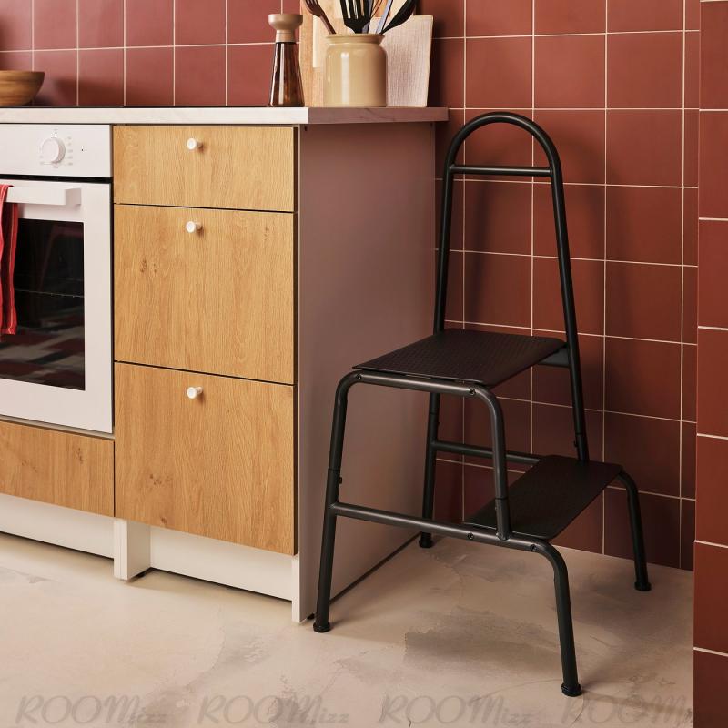 シンプルなデザインのダークグレーのBÄSINGEN/ベーシンゲン シリーズは、家での毎日の作業を楽にするためにつくられています。 つかみやすい手すり付きの2段のステップスツール。高い位置に収納されているものに簡単に手が届きます