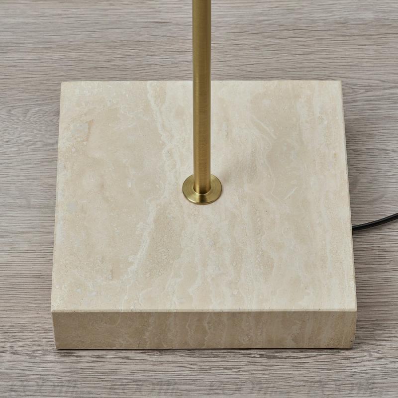 ランプを安定させるトラバーチン製ベースの上に、すっきりとエレガントな黄銅色の支柱と、心地よい光が広がる優れた構造のテキスタイルシェードを組み合わせています。 洗練されたクラシックスタイル!