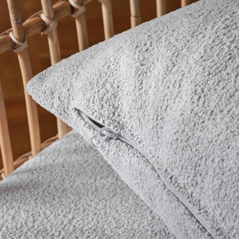 カバーに使用しているジュールモ 布地は、綿とポリエステルでできた凹凸のある質感のブークレ生地で、柔らかな手ざわりです