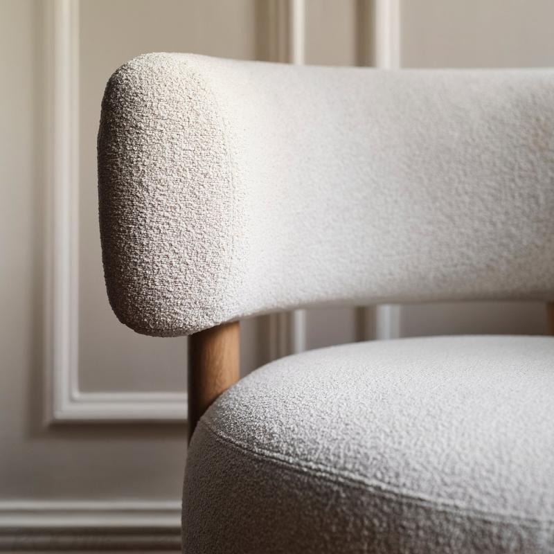 モダンなスカンジナビアンデザインへのトリビュート。 スタイリッシュでゆったりとしたパーソナルチェアです。 オーク無垢材製の脚、やさしく包み込むようなフォルム、モコモコした張り地が、心地いいぬくもりを感じさせます