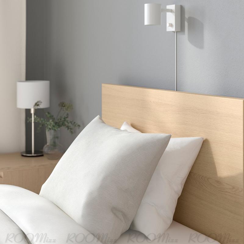 突き板を使用した、すっきりとしたデザイン。 部屋の真ん中に置くことも、ヘッドボードを壁につけて設置することもできます。 予備の寝具をしまうスペースが必要なら、キャスター付きのMALM/マルム ベッド下収納ボックスをプラスしましょう