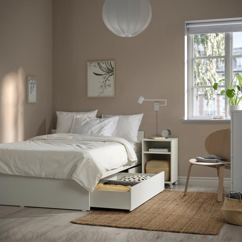シンプルで合わせやすいベッドフレームに、ベッドルーム用品が全部入る収納ボックスが2個付いています。 VIHALS/ヴィーハルス シリーズのほかの家具とコーディネートが楽しめるスマートなソリューションです