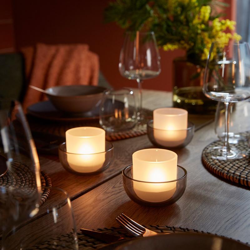 ティーライトホルダーをそれぞれ単独で使うこともできれば、広いホルダーの中に高いホルダーを重ねて美しい色の効果を生み出すこともできます