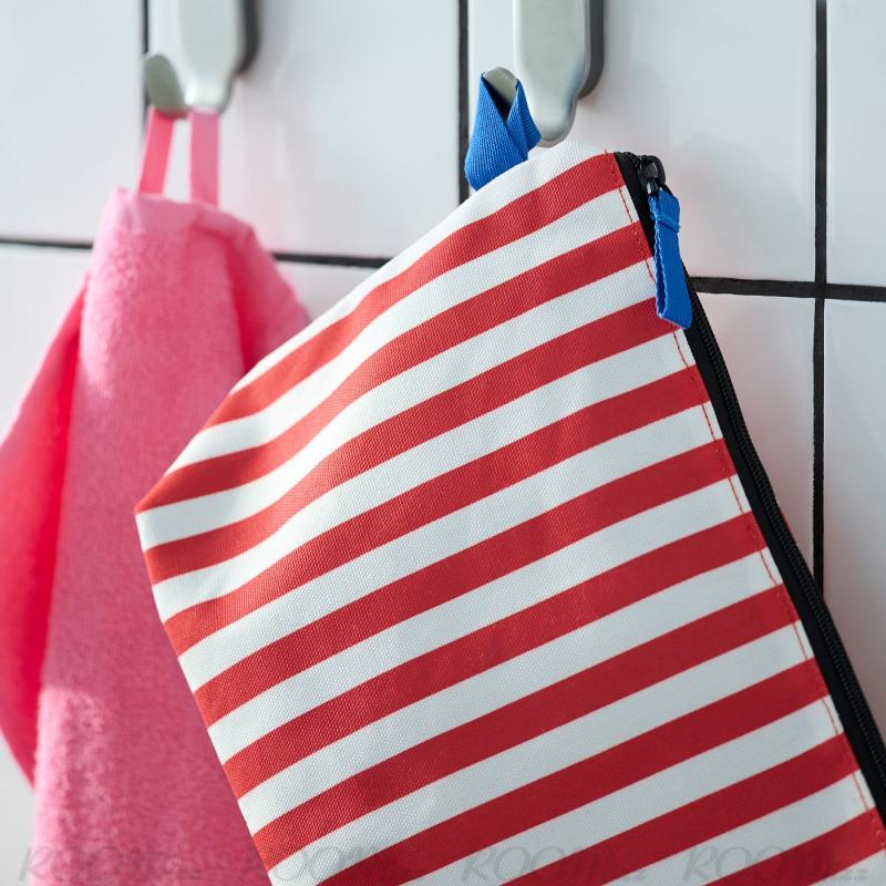 鮮やかなレッド/ホワイトのストライプのSKOGSSALLAT/スコグスサラト 洗面ポーチで、朝を元気にスタートさせましょう。 仕切られた4つのスペースに整理できるので、外出先で必要なものがすぐ見つかります
