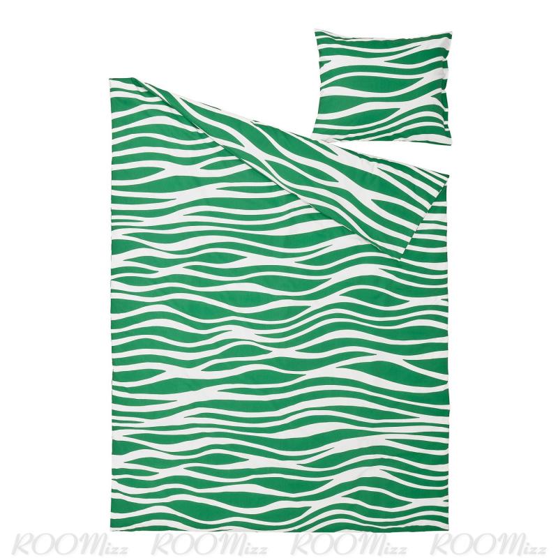 PORTLAKMÅLLA/ポールトラークモラ 掛け布団カバーセットは、鮮やかなグリーンの波形のストライプがあしらわれており、部屋に新鮮な雰囲気をもたらします。 コットン/レーヨン混紡の布地は、上品な光沢、通気性、柔らかな肌触りが特徴です