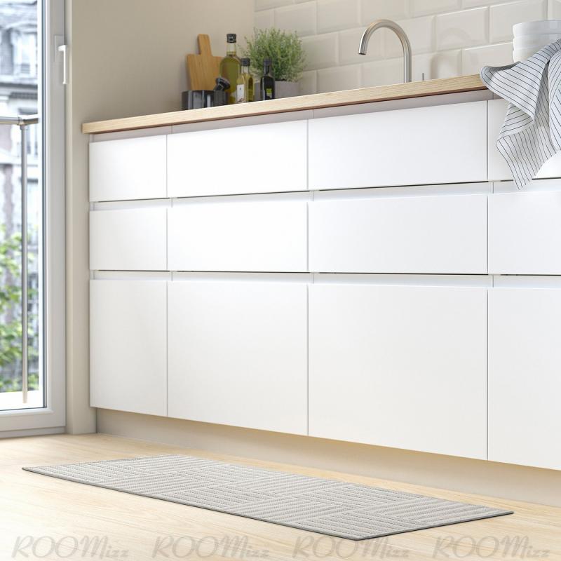 グレーとホワイトのストライプがつくる市松模様が床を明るく演出するキッチンマット。ほとんどのインテリアによく合います。 快適な歩き心地で、簡単に洗濯機で洗えます