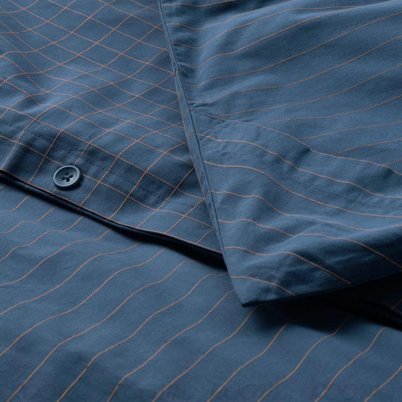 ダークブルー/ライトブラウンのDOFTAKLEJA/ドフタクレイヤ 掛け布団カバーは、片面にチェック模様のステッチ、もう片面にはストライプのステッチ入り。 角に穴があいているので掛け布団が入れやすく、穴の上にはポケットを付けて見えないようにしています