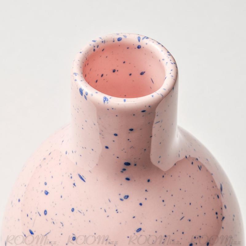かわいいピンクの花瓶。 ハンドスプラッシュで散らしたブルーの斑点が、独特の表情を生み出します。細口なので、一輪咲きの花に最適です。 花を生けたり、装飾的なオブジェとして、家中どこでも使えるステキな花瓶です
