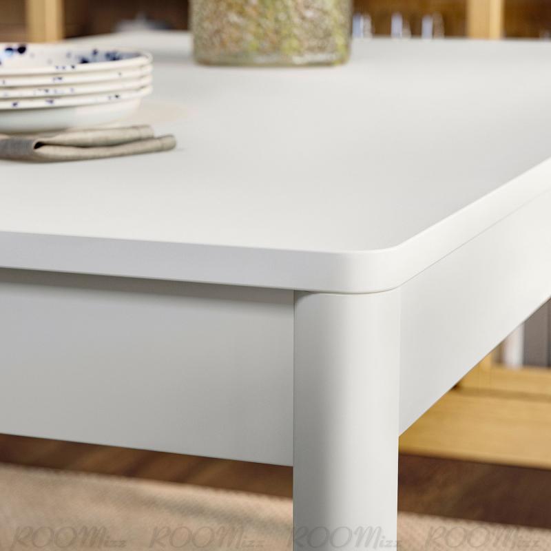マットなオフホワイトで、滑らかな丸みを帯びたコーナーが特徴の4人用テーブル。日々の暮らしの中でお気に入りの場所になるようにつくられています