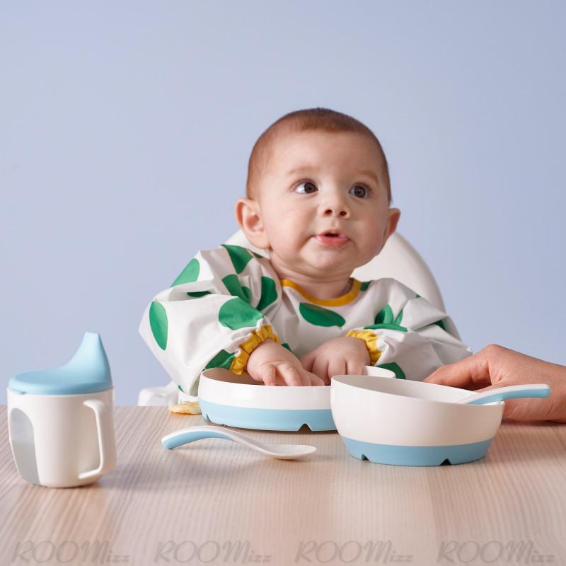このプレートとボウルは、お子さまが食べ物をスプーンですくいやすいデザインです。高い縁は少し内側に曲がっています。広い底には滑り止めが付いているのでずれにくく、安定感があります
