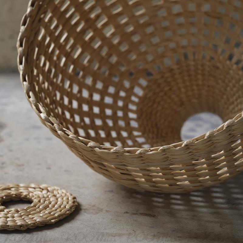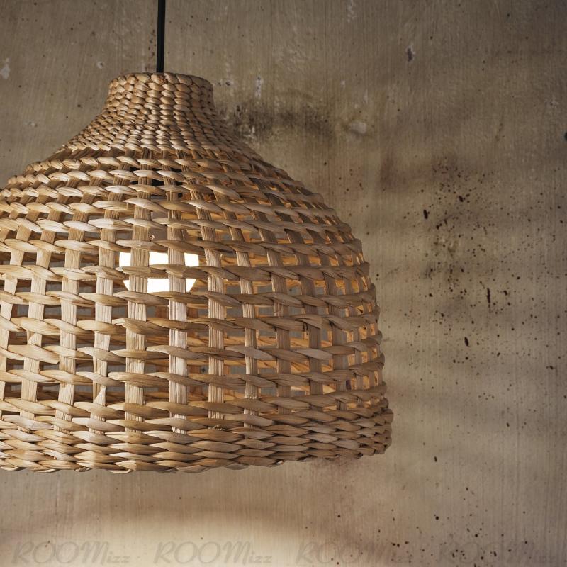 家の中に自然を招き入れましょう。 バナナ繊維を手編みしてつくったランプシェードのすき間から装飾的な光がこぼれて、室内にぬくもりのある心地いい雰囲気を演出します
