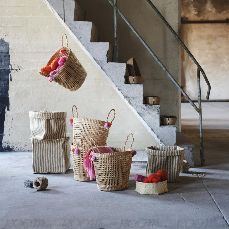 パルミラヤシの葉の耐久性に優れた繊維により、独特な構造の手編みのバスケットに仕上がっています