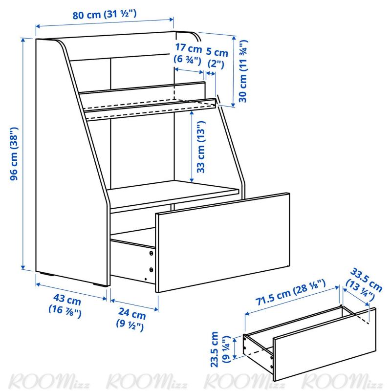 スペースを取らない実用的な収納。上部にはブックディスプレイ、下部には棚と引き出しがあって、おもちゃやゲーム、絵本などを収納できます