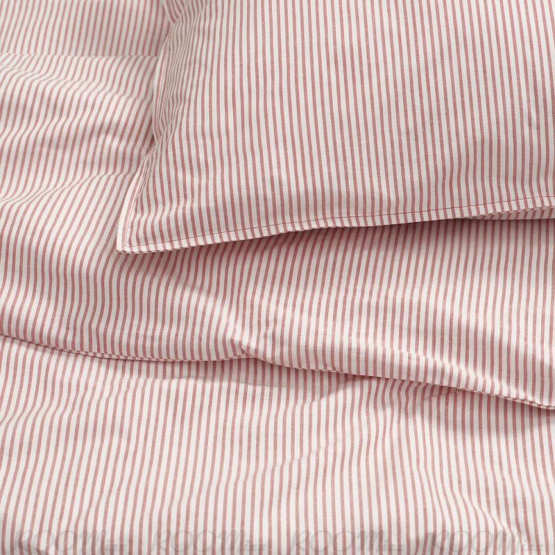 SOLFIBBLA/ソルフィブラ 掛け布団カバーセットは、柔らかな綿100%で、流行に左右されないすっきりとしたレッド/ホワイトの先染めストライプが特徴です。 太めの糸が、心地よい手づくり感とほんのり漂うヴィンテージの魅力をベッドルームにプラスします