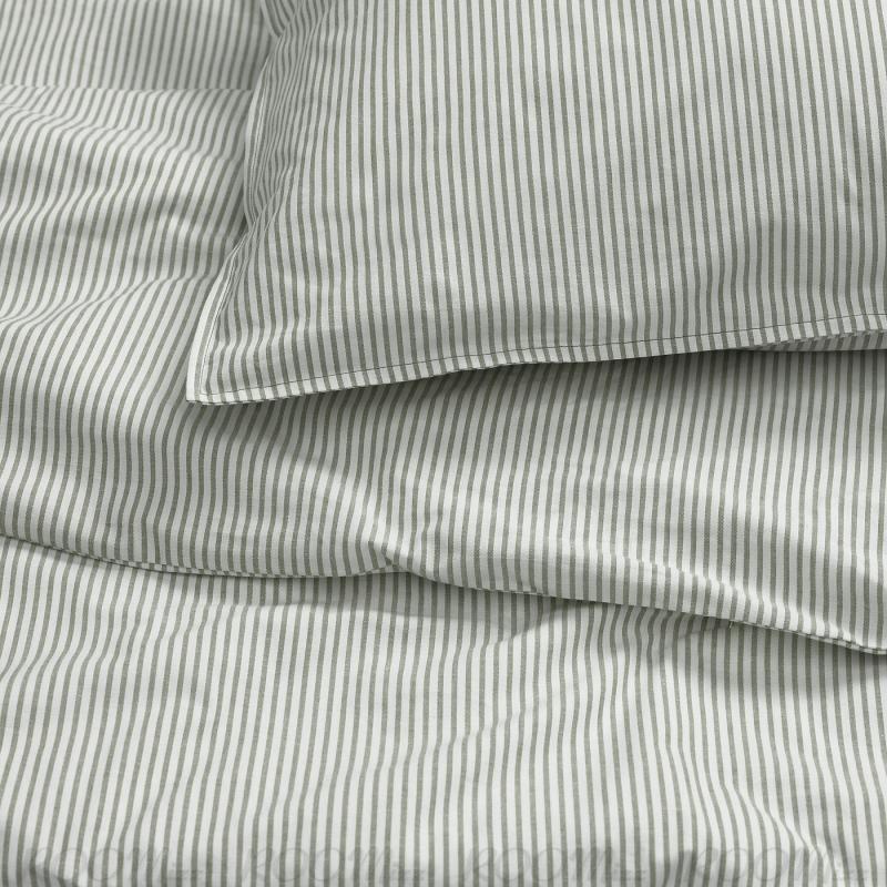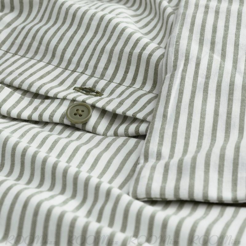SOLFIBBLA/ソルフィブラ 掛け布団カバーセットは、柔らかな綿100%で、流行に左右されないすっきりとしたグリーン/ホワイトの先染めストライプが特徴です。 太めの糸が、心地よい手づくり感とほんのり漂うヴィンテージの魅力をベッドルームにプラスします