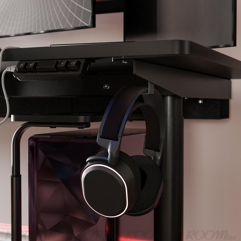 ベースキャンプや戦場になるオールインワンのゲーミングデスク。立っても座っても使えます。 モニターを3台設置できるアーム、ゲーミングギアを収納する有孔ボード、ヘッドホン用のフック付き。 さあ、ゲームを始めましょう!