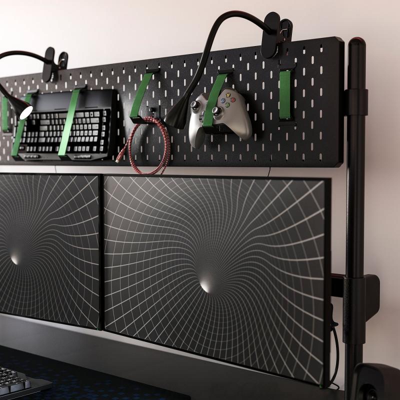 付属の伸縮ストラップやフック、ブラケットを使って、上部の有孔ボードにゲーミングギアやケーブルを整理できるので、モニターに「ゲーム開始」の文字が表示されたら、必要なアイテムをさっと手に取れます