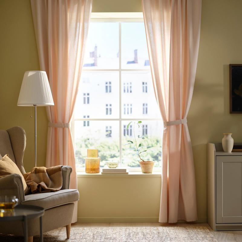 ライトピンクの綿のLENDA/レンダ カーテンはヘディングテープ付き。リブ(畝)のある質感が個性をプラスします。 リビングルームやベッドルームにぴったり。重ね使いの窓装飾にも最適です。 タッセルがおしゃれな雰囲気を演出します