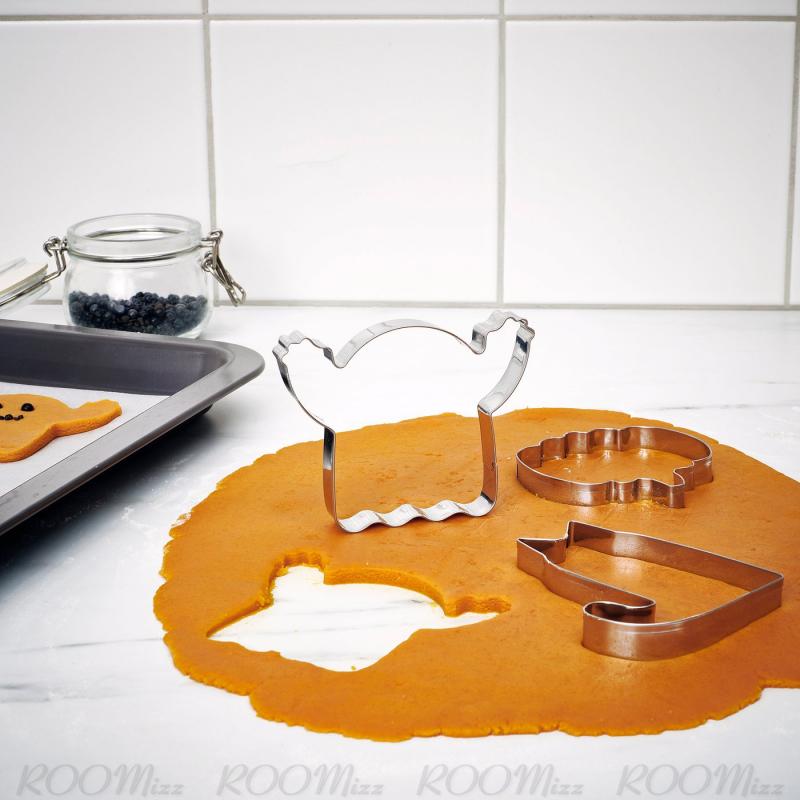 このクッキー型3個セットを使えば、ネコ、おばけ、カボチャの形のハロウィンクッキーを簡単につくれます