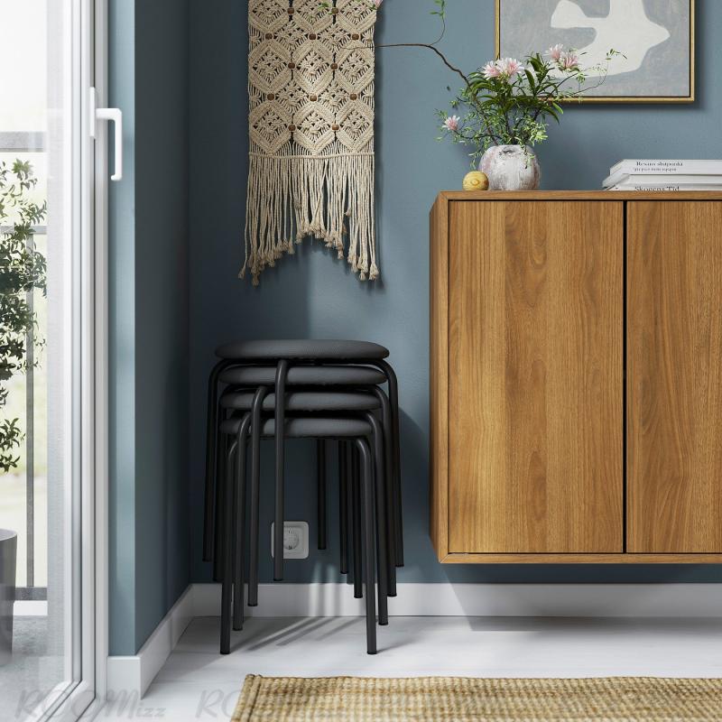 布張りのGULTARP/グルタルプ スツールは柔らかなクッション材入りで、あなたも友達も快適な座り心地です。 重ねて収納できるので場所をとりません。何脚か用意しておきませんか?