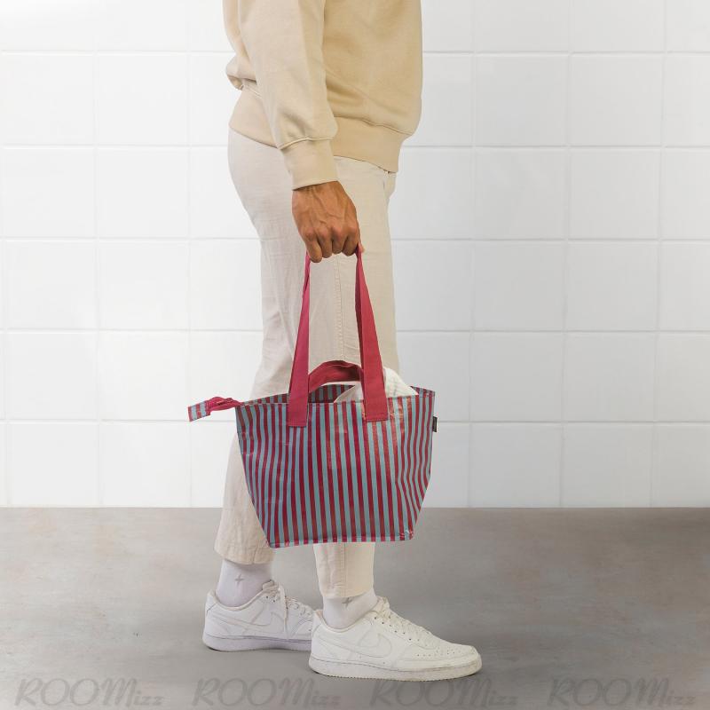 レッドのストライプをあしらった小さなキャリーバッグ。短い持ち手と長い持ち手が両方付いていて、楽に持ち歩けます。 ファスナーも付いているので安全です。 便利で、耐久性があり、安心して使えるバッグは、ちょっとした用事や、ランチ、スタイリッシュなギフトバッグにもぴったり