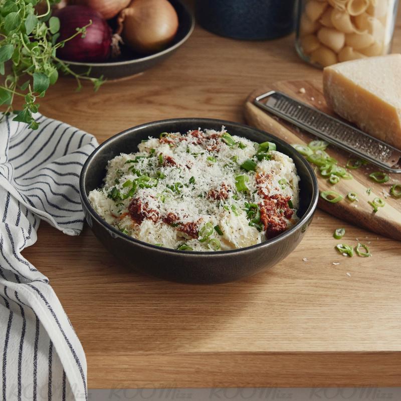 深皿としても使える小さめのオーブン皿。 美しいダークグレーの釉薬(ゆうやく)が料理を引き立て、オーブンからそのままテーブルに出すだけでスタイリッシュな食卓を演出します