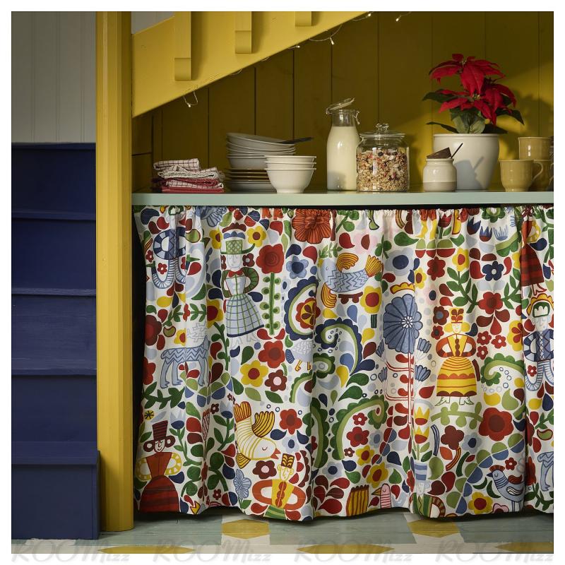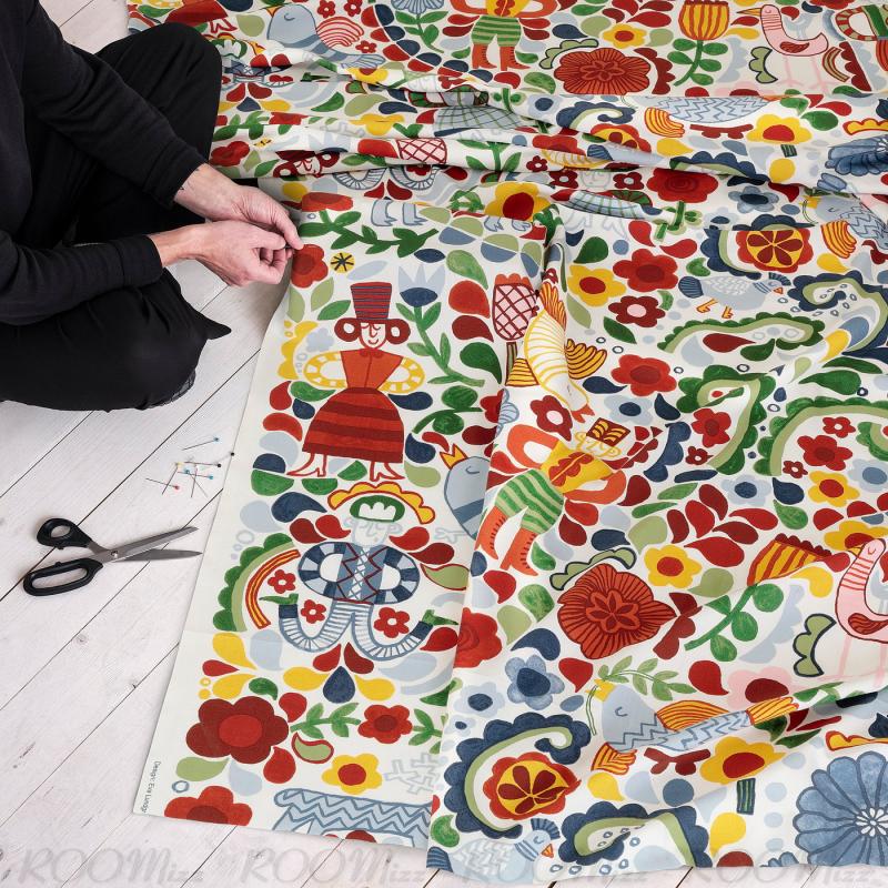 カラフルなカットクロスを、新たな創作のベースにしましょう。 民族衣装の男女が花や鳥に囲まれているプリント柄は、Eva Lundgreenのデザインで、北欧のフォークロアをインスピレーションにしています