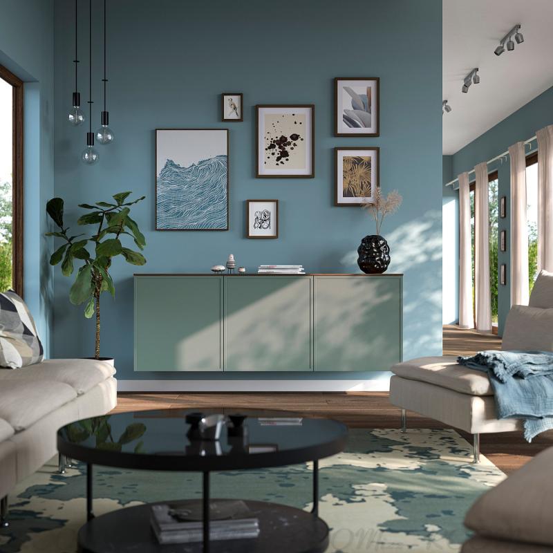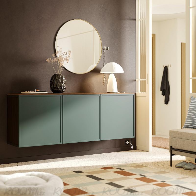 スタイリッシュで実用的なサイドボードコンビネーション。扉の奥に目隠し収納、上にディスプレイができます。 ウォールナット調のトップパネルが温かみをプラスし、キャビネット3個のジョイント部分を隠します