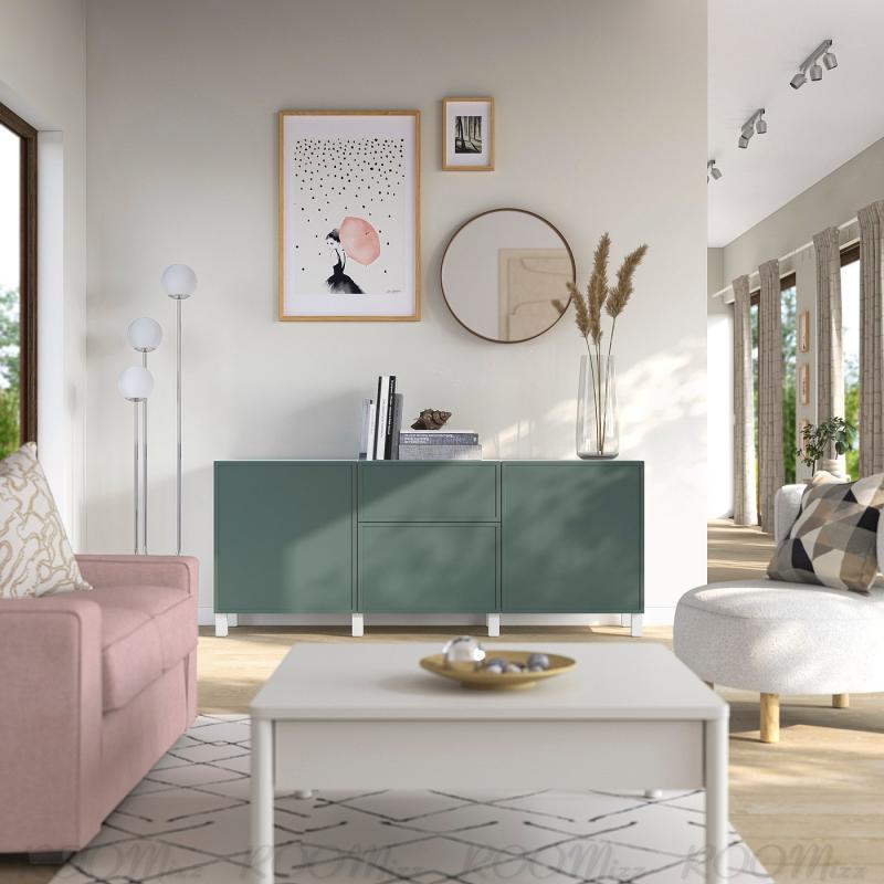 BESTÅ ベストー 収納コンビネーション 引き出し付 - クルークマカーレ ダークグレーグリーン/ストゥッバルプ ホワイト 180x42x74 cm
