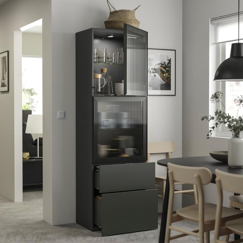 BESTÅ ベストー 収納コンビネーション ガラス扉付き - ダークグレー ラップヴィーケン/フェルスヴィーク チャコール 60x42x193 cm