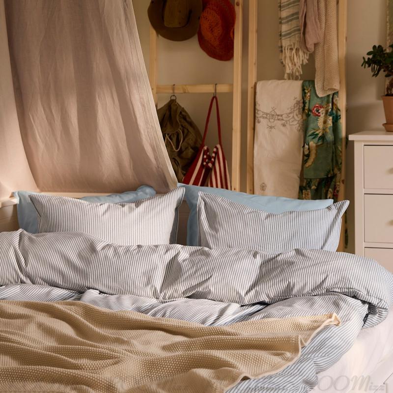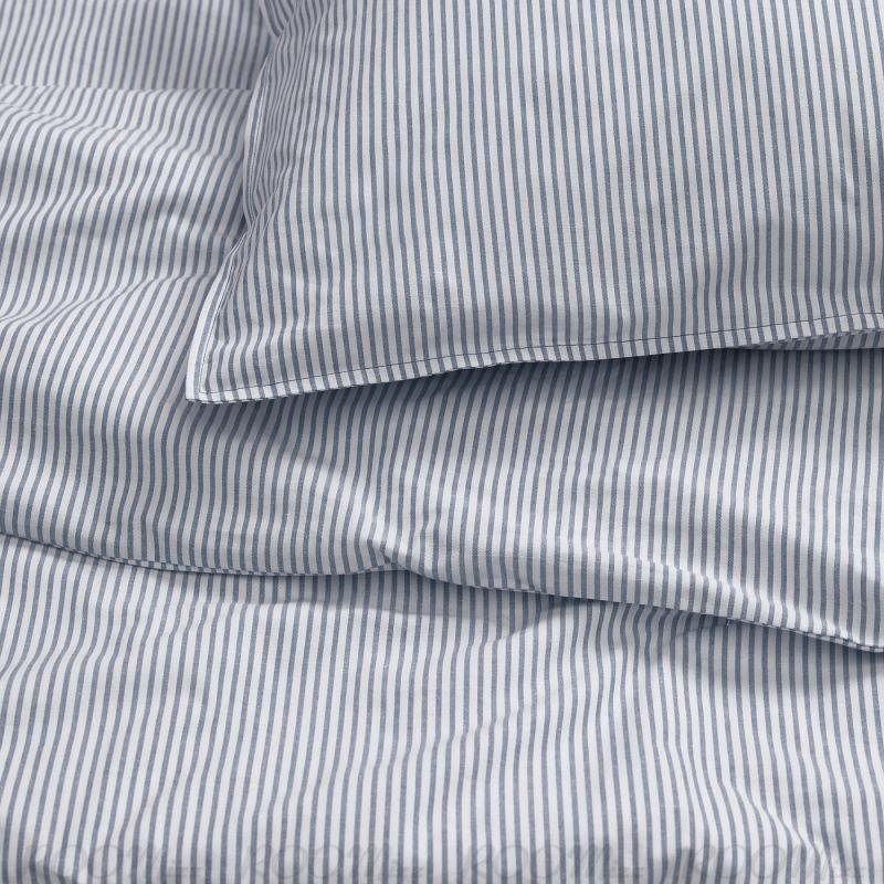 SOLFIBBLA/ソルフィブラ 掛け布団カバーセットは、柔らかな綿100%で、流行に左右されないすっきりとしたブルー/ホワイトの先染めストライプが特徴です。 太めの糸が、心地よい手づくり感とほんのり漂うヴィンテージの魅力をベッドルームにプラスします