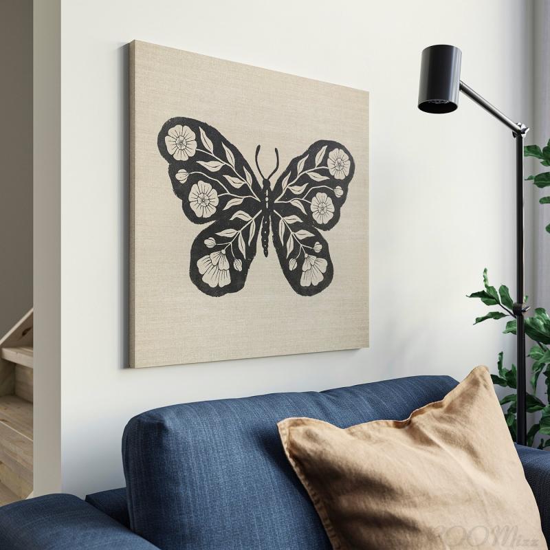 チョウのデザインが印刷されている素朴なキャンバスが、ナチュラルな雰囲気とテクスチャーをアート作品にプラスしています