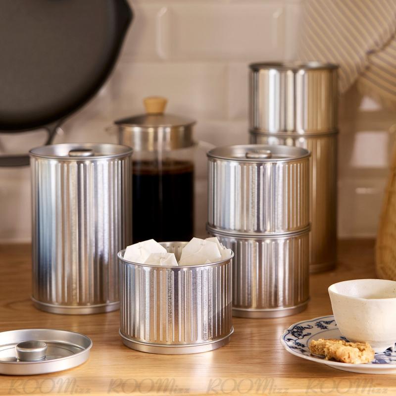 この缶(1.3L)は、コーヒーやお茶、スパイスにぴったりです。 挽いたコーヒーは約450g、茶葉は350g入ります