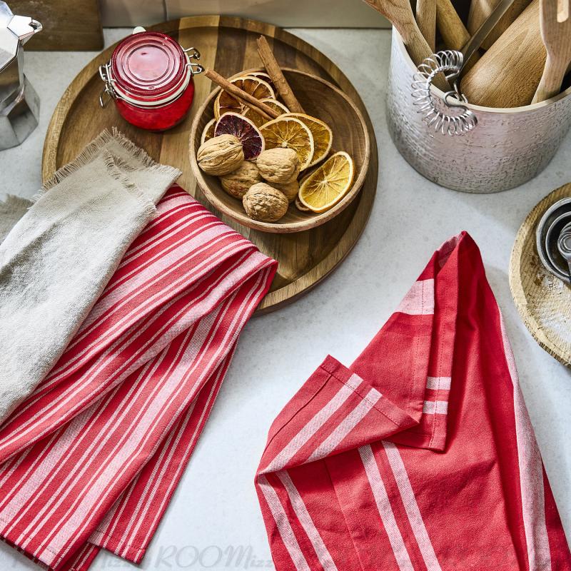 クリスマスカラーの明るいキッチンクロスなら、料理やお菓子づくり、洗った食器の水気の拭き取りがもっと楽しくなります。 このキッチンクロスはピュアコットン製。つり下げループ付きなので簡単につるして収納できます