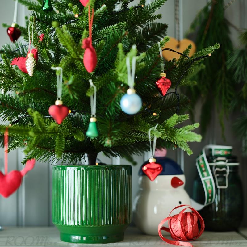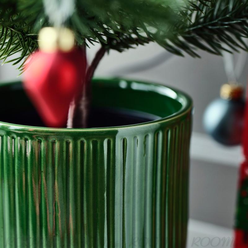 鉢カバーのかすかなストライプとクラシックなクリスマスカラーの美しい釉薬(ゆうやく)が、室内にぬくもりのある心地いい雰囲気を演出します。 季節の植物や人工観葉植物を組み合わせましょう