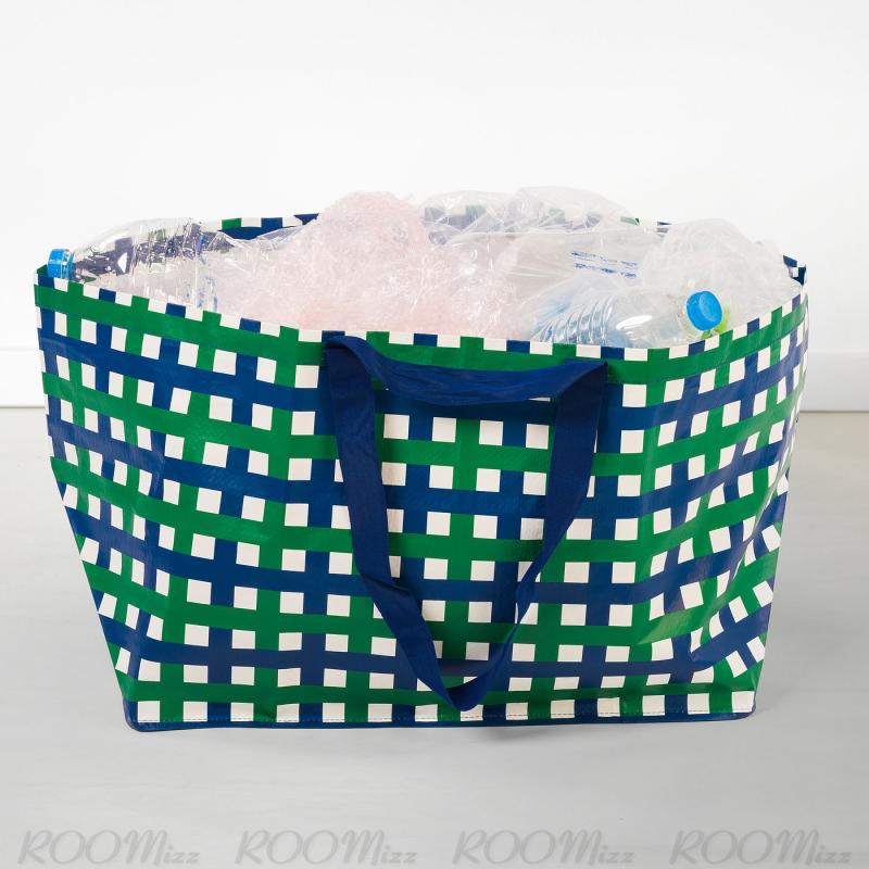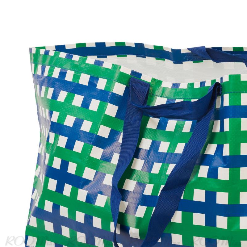 VINTERFINT/ヴィンテルフィント コレクションの大容量で頑丈な大きいキャリーバッグ。大胆なブルーとグリーンの模様が特徴で、クリスマスの買い物や、収納、ギフトにぴったりです。 リユースでき、目を引くデザインで、日常使いやクリスマスシーズンに活躍します