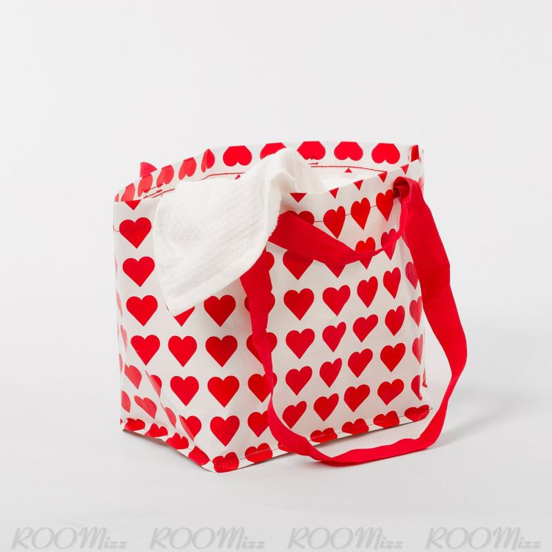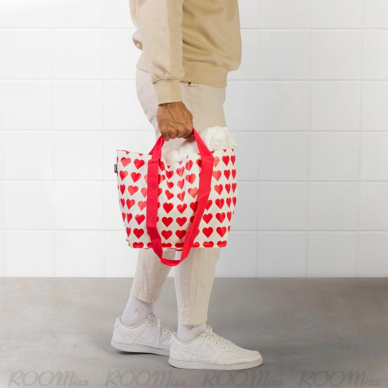 白地に楽しいレッドのハートをあしらった、VINTERFINT/ヴィンテルフィント コレクションの小さくて便利なバッグ。 長い持ち手と短い持ち手が両方付いているので持ちやすく、ギフトやランチ、クリスマス用にぴったりです。 リユースでき、耐久性も優れています