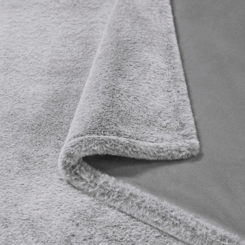 グレーのクッションカバーとひざ掛けのふわふわの表面をなでると、まるで動物の柔らかい毛をなでているような手ざわりですが、実は素材はリサイクルポリエステル100%。 両方一緒に使えば、暖かく快適に過ごせます