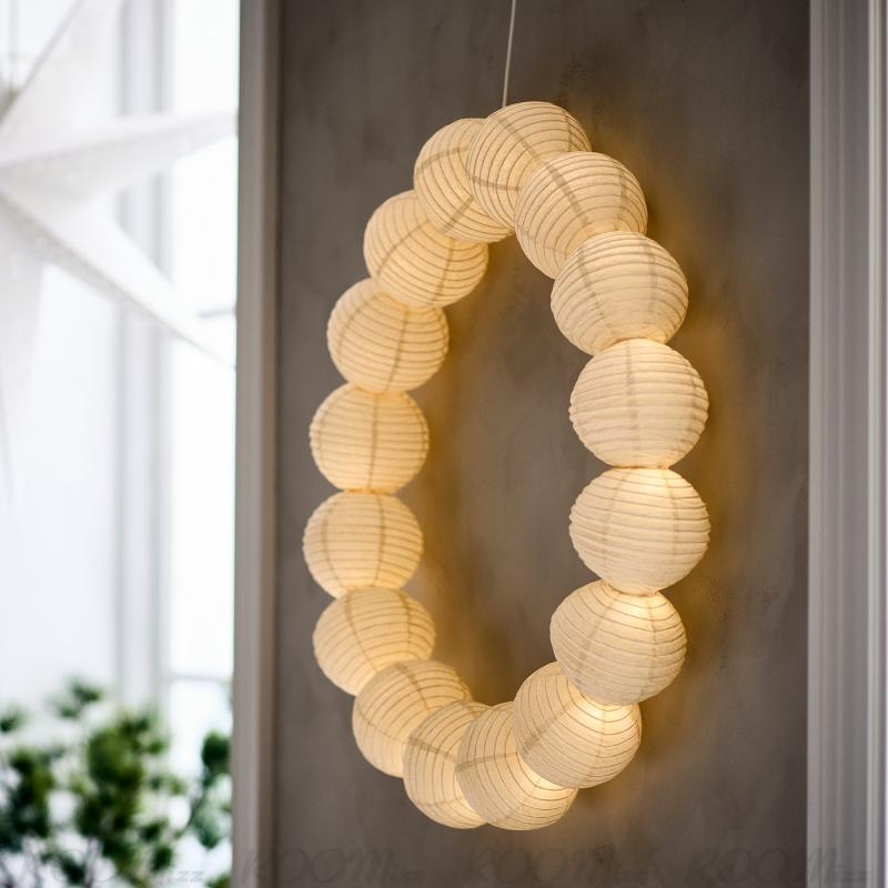 ペンダントランプ、それともリース? 決めるのはあなたです! コードを調節することで、ランプを天井からつるすことも、壁に掛けることもできます。 どちらにしても、複数の小さな丸い明かりが部屋に心地よい雰囲気をつくります