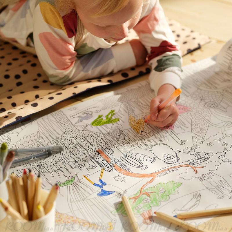 若いアーティストたちの夢がかないます。長さ10mのぬり絵ロール紙には、サバンナのすばらしい動物や植物がたくさん描かれています。 ロール紙を広げて、さっそくフェルトペンや水彩絵の具で色を塗りましょう!